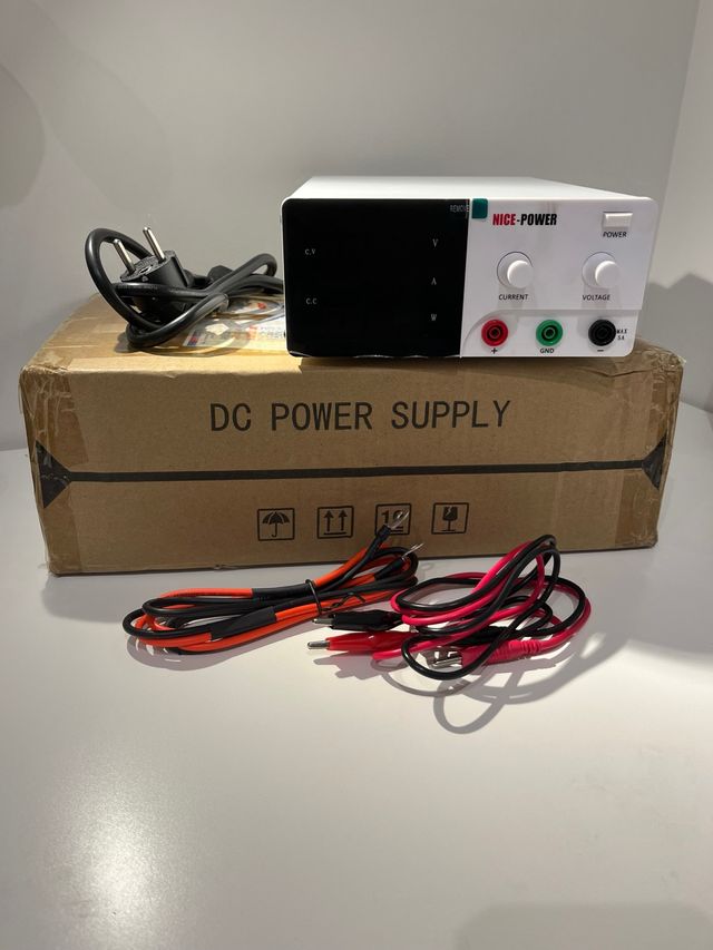 Fuente de Alimentación 15V 30A. Limitación de Amperaje regulable manualmente y Autodetección de consumo. Incluye cables Banana Cocodrilo para conexión delantera y cable de conexión trasera para salida de fuerza 30A